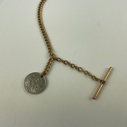 Jan Lot 54- Men's YGF 13-ince Pocket Watch Chain w/ Canadian 5 cent coin