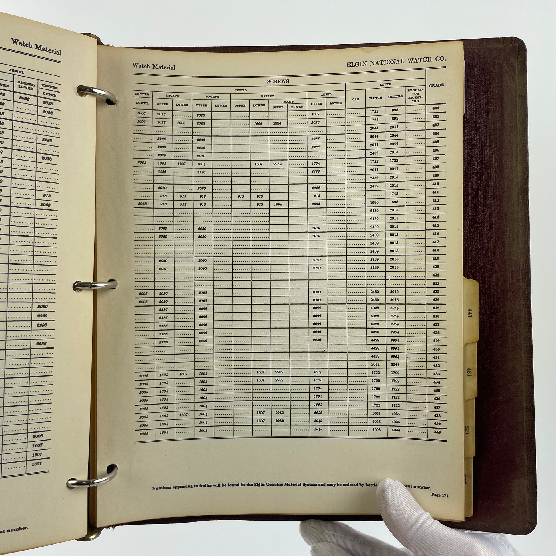 This is an Elgin Genuine Factory Material Catalog. This is in good pre-owned, no odor minor page yellowing from age, and minor damage to outer binder, internal pages are in good condition.