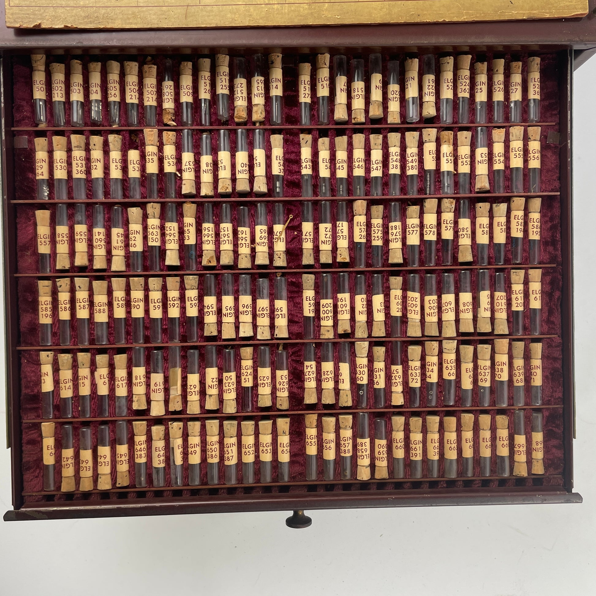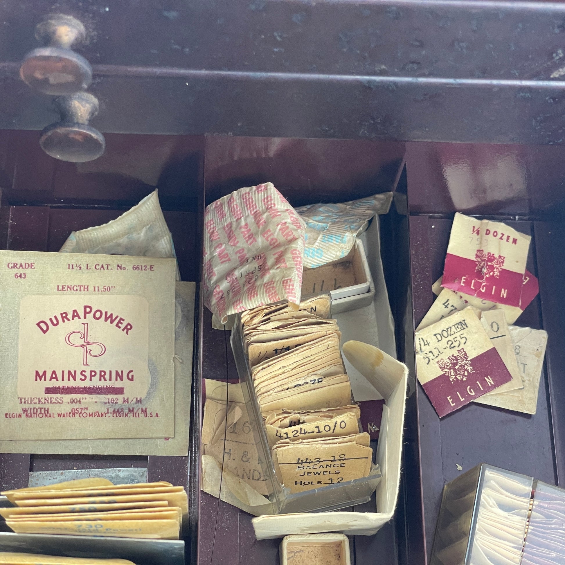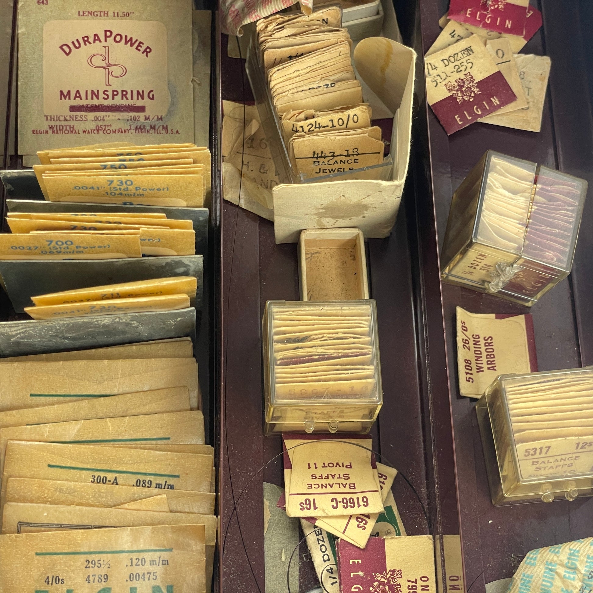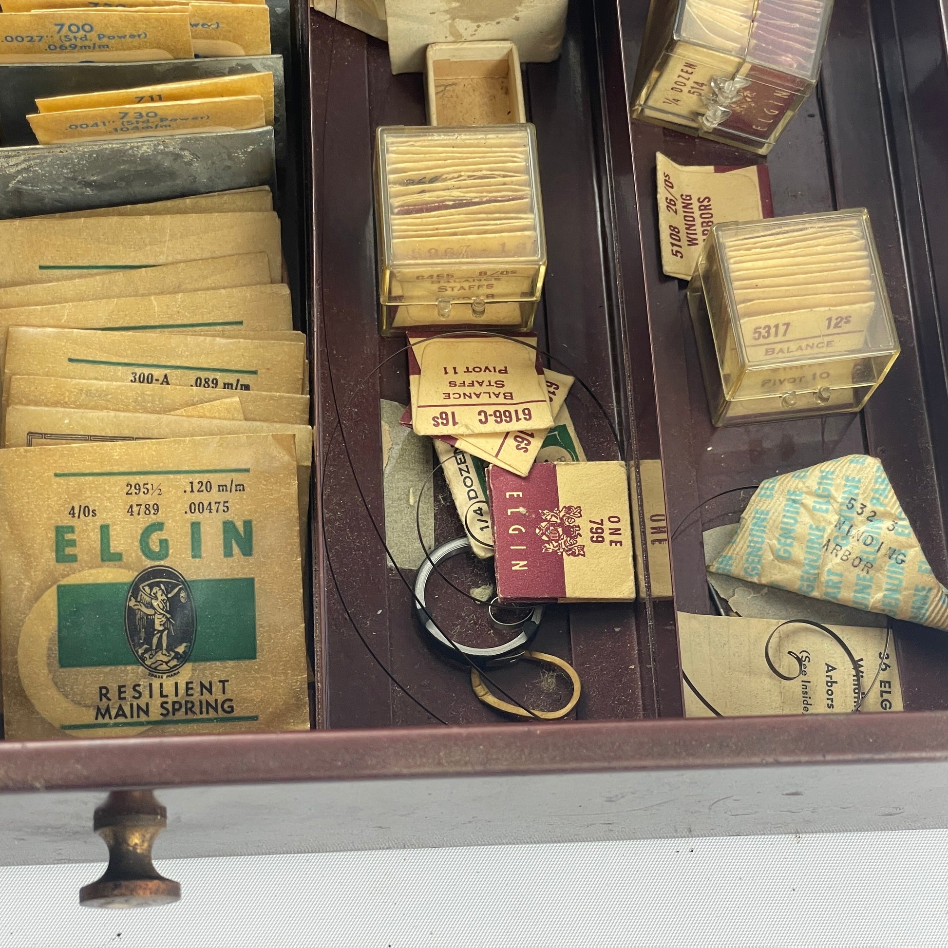 This is a Genuine Elgin Factory Parts Cabinet. This cabinet has been used by the previous watchmaker and is not fully stocked. It will make a great addition to your own material or will be a great start to the first timers material. The bottom drawer is full of NOS mainsprings. Please note: any vials that are upside down are empty.