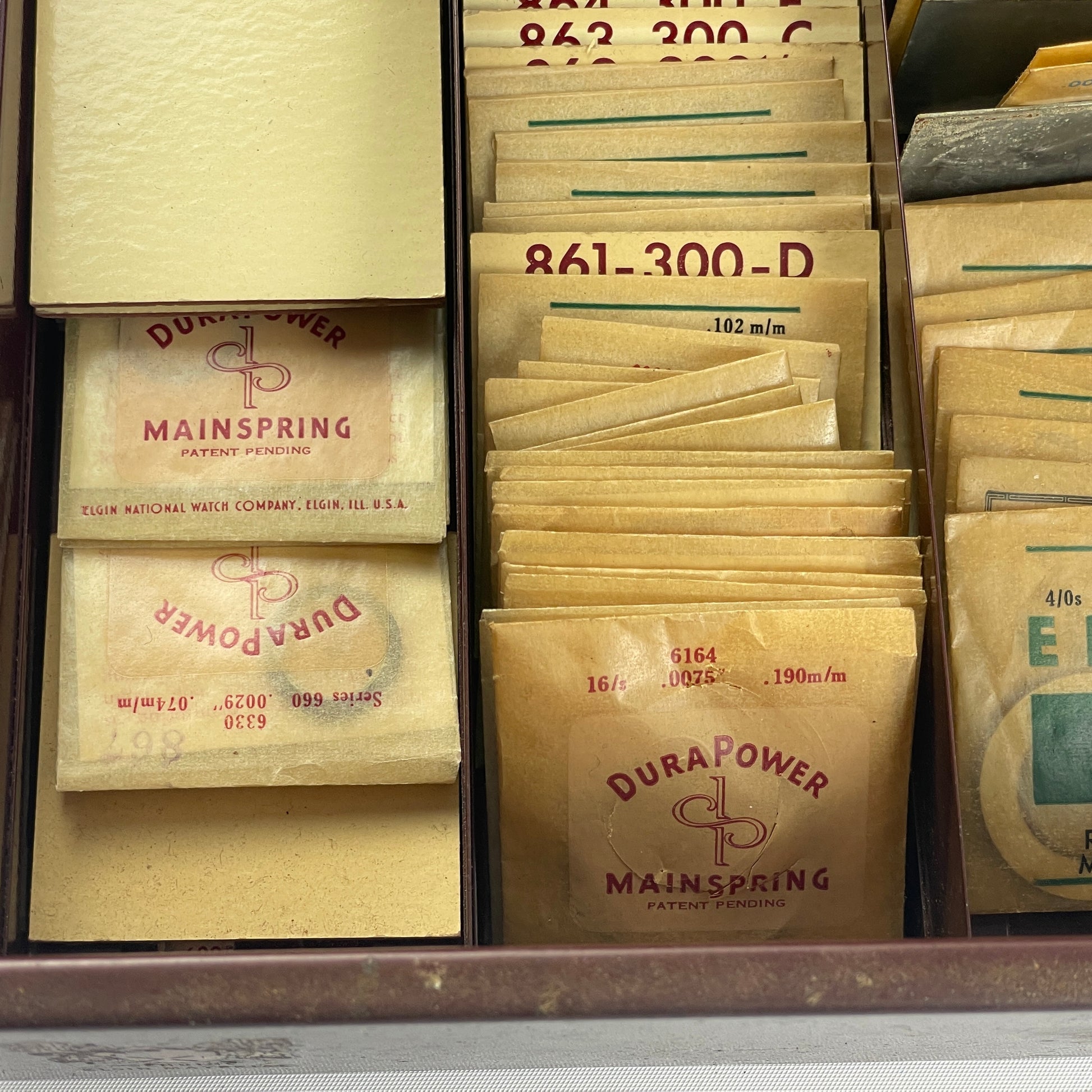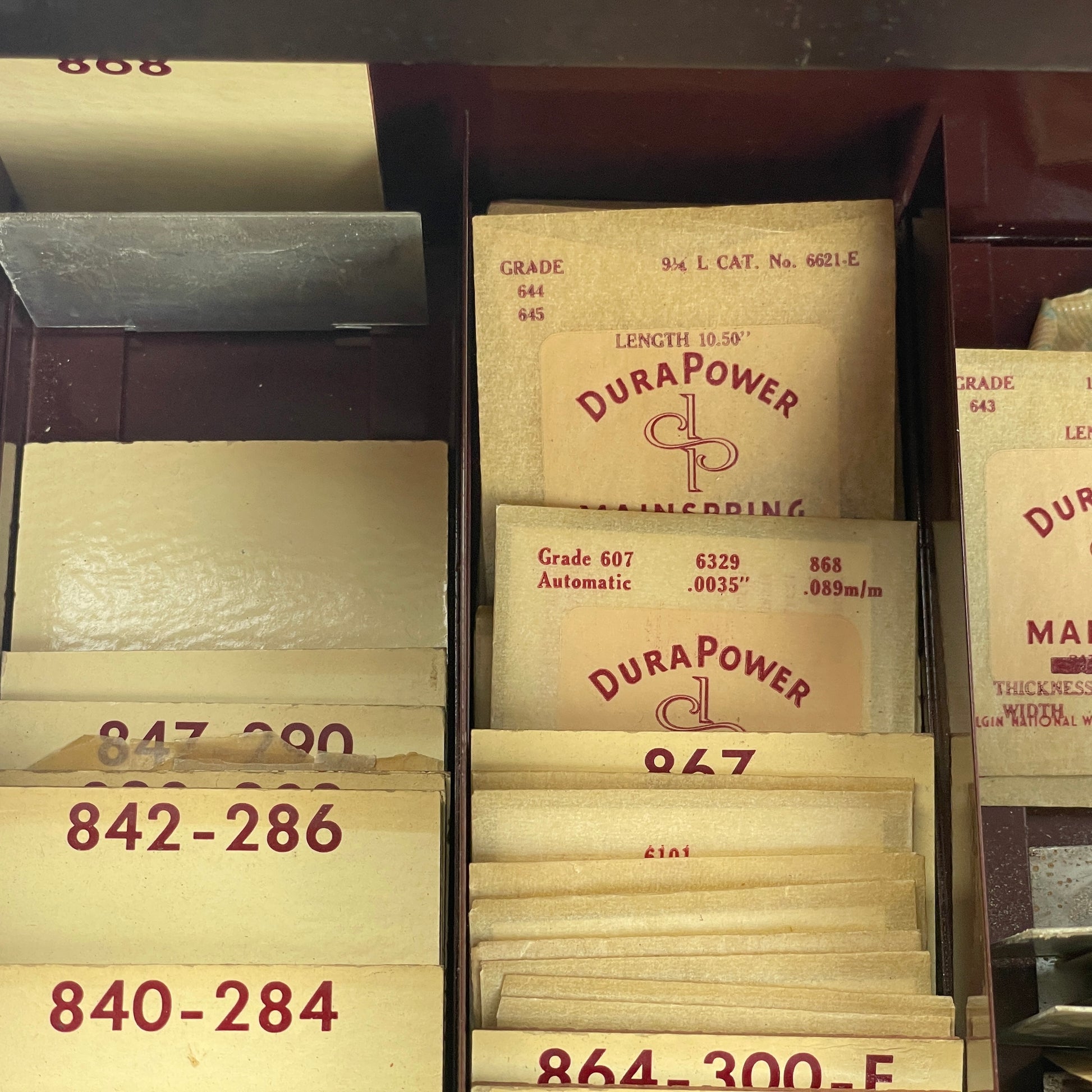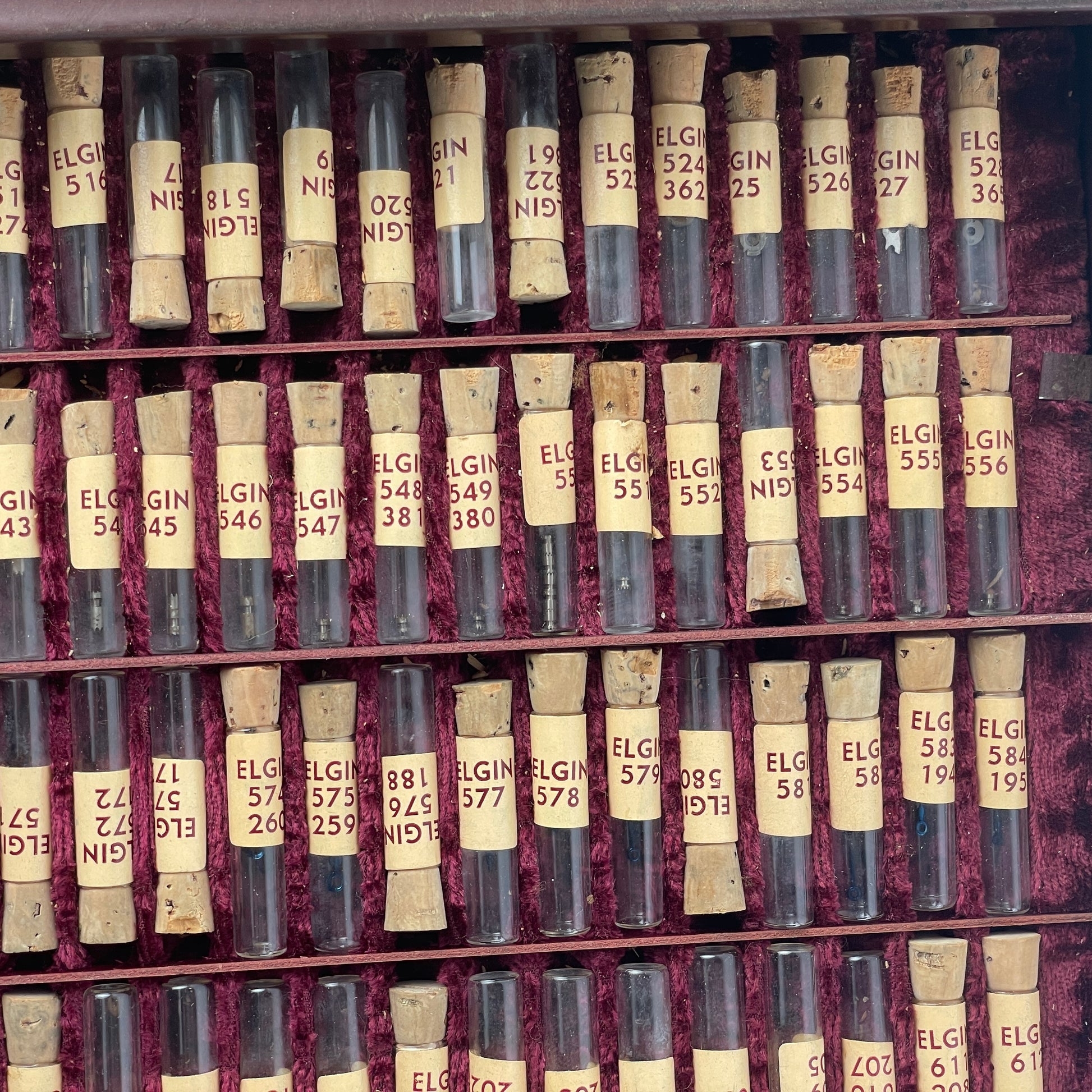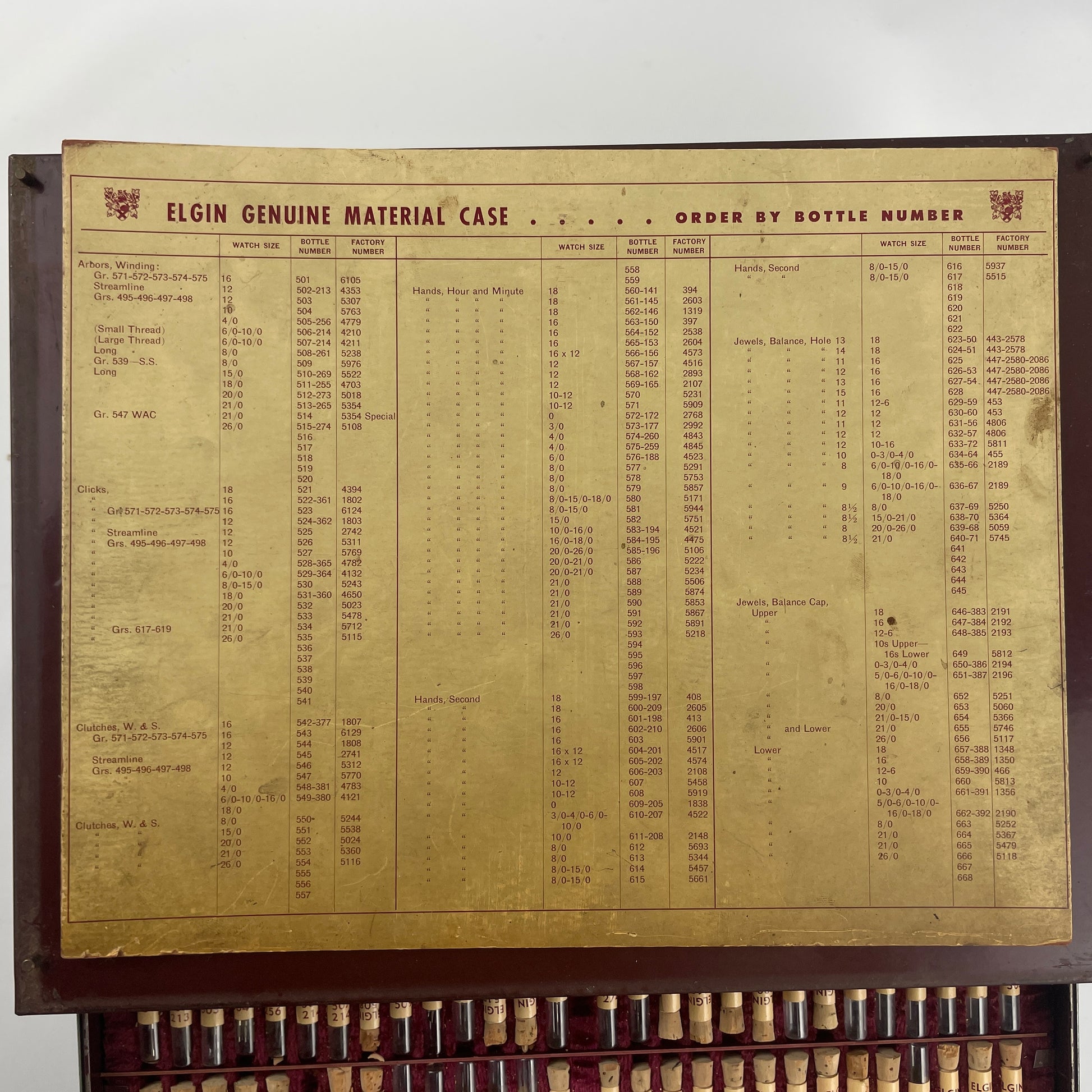 This is a Genuine Elgin Factory Parts Cabinet. This cabinet has been used by the previous watchmaker and is not fully stocked. It will make a great addition to your own material or will be a great start to the first timers material. The bottom drawer is full of NOS mainsprings. Please note: any vials that are upside down are empty.