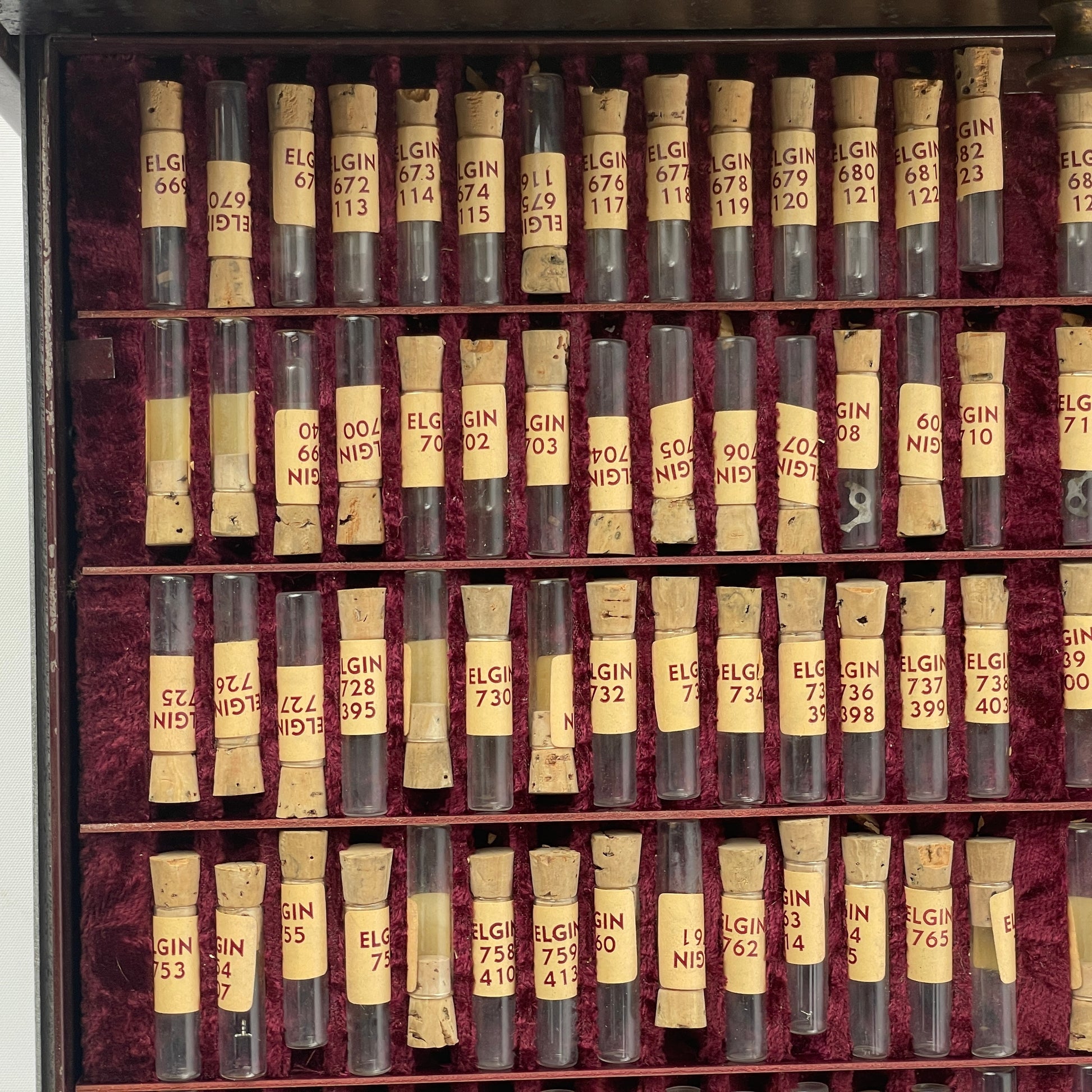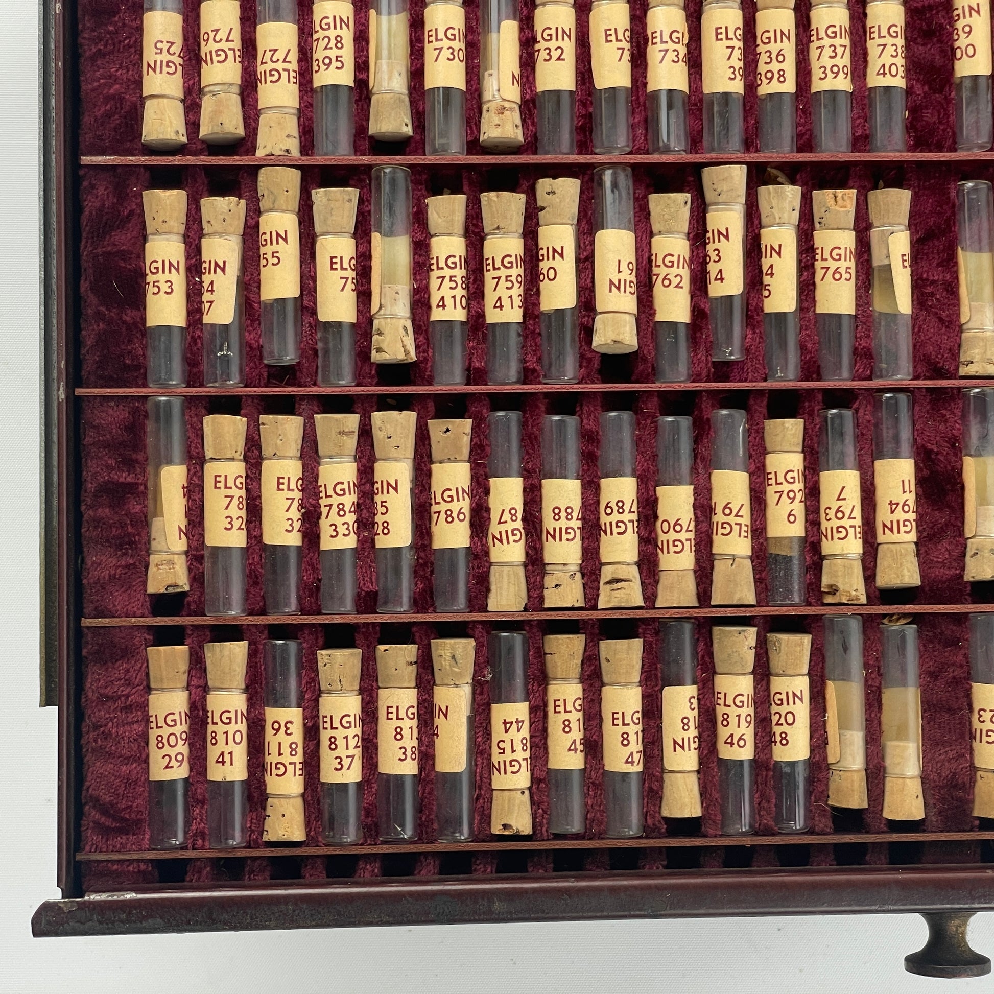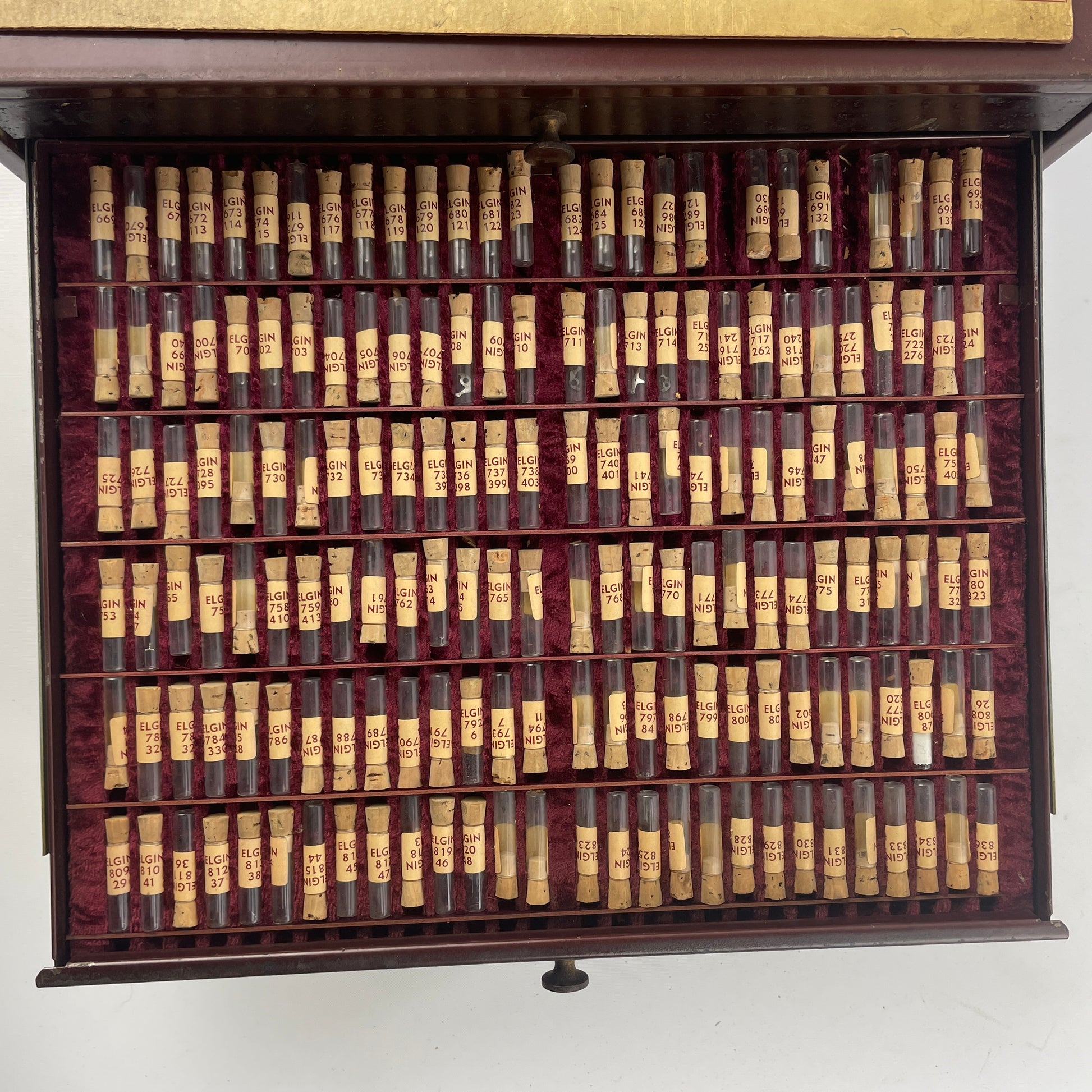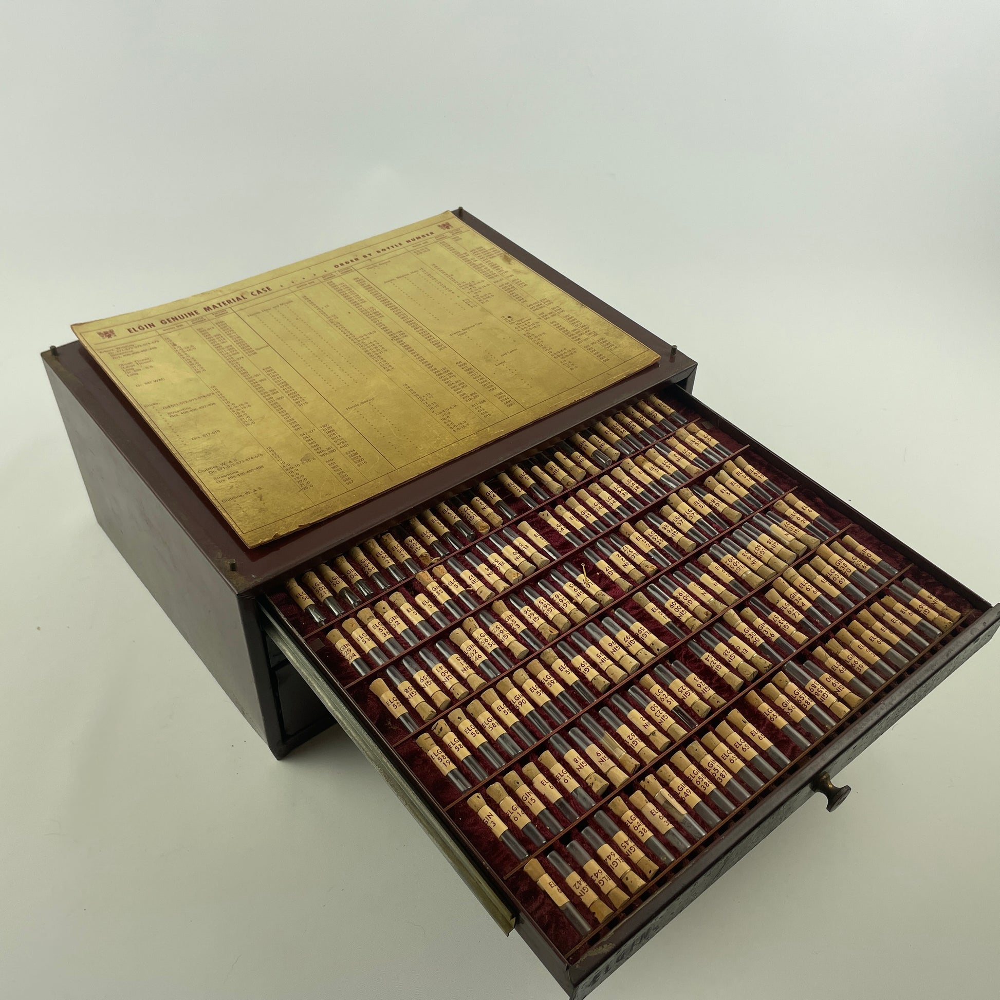 This is a Genuine Elgin Factory Parts Cabinet. This cabinet has been used by the previous watchmaker and is not fully stocked. It will make a great addition to your own material or will be a great start to the first timers material. The bottom drawer is full of NOS mainsprings. Please note: any vials that are upside down are empty.
