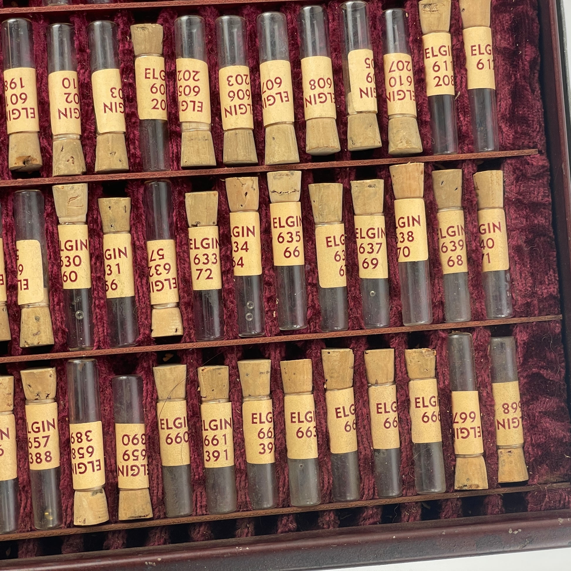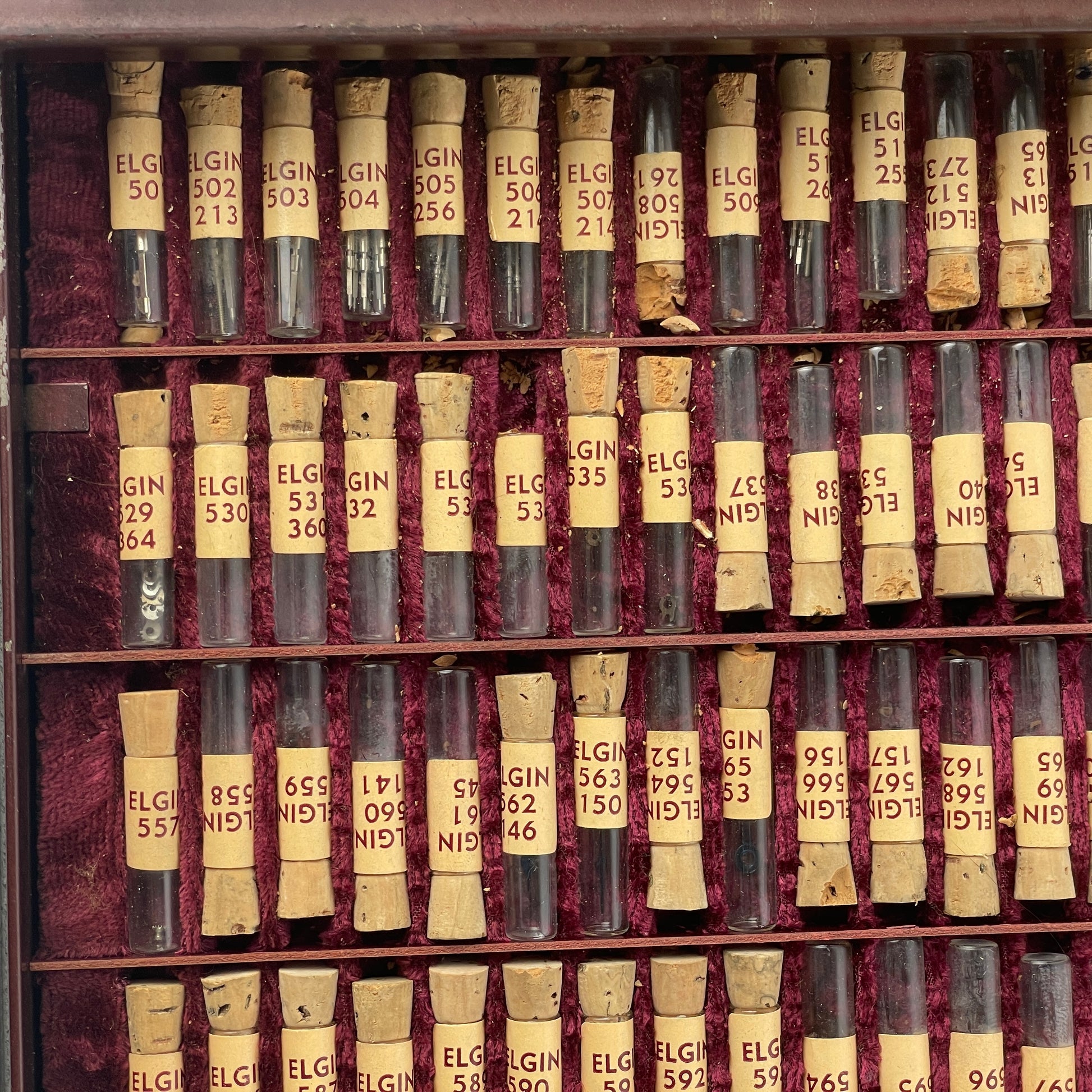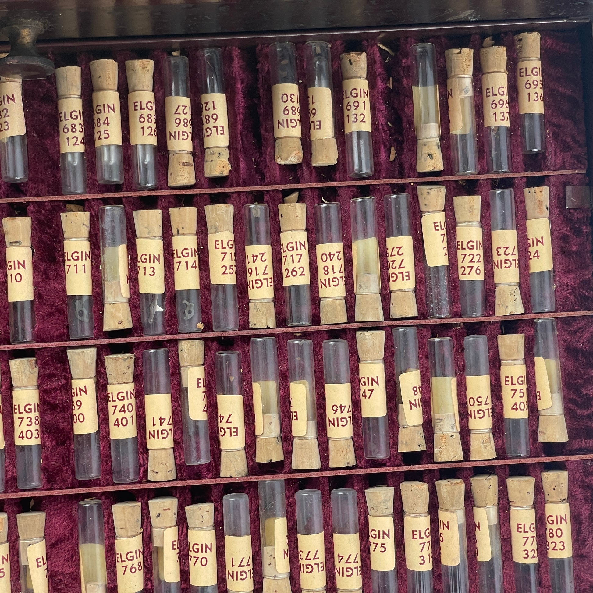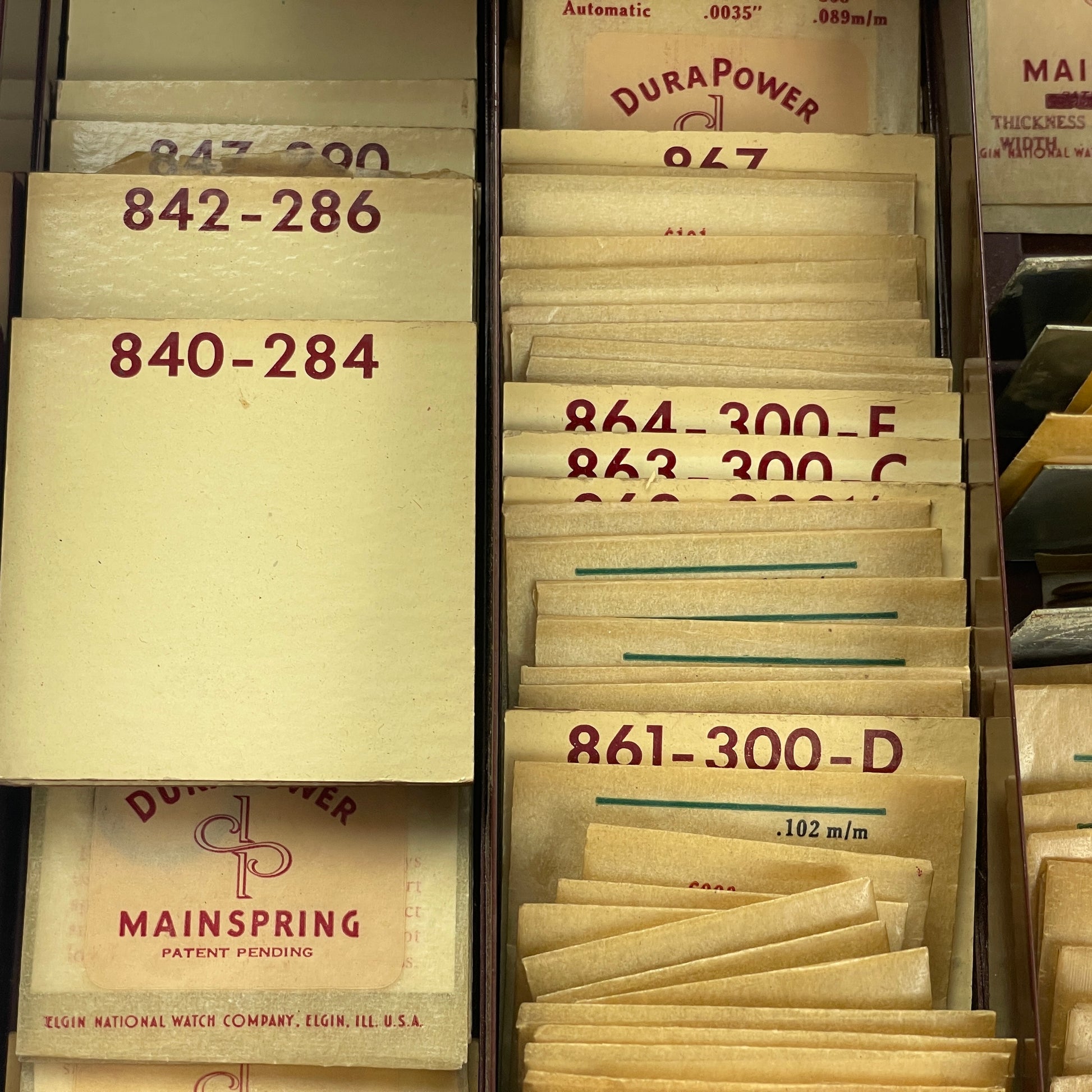 This is a Genuine Elgin Factory Parts Cabinet. This cabinet has been used by the previous watchmaker and is not fully stocked. It will make a great addition to your own material or will be a great start to the first timers material. The bottom drawer is full of NOS mainsprings. Please note: any vials that are upside down are empty.