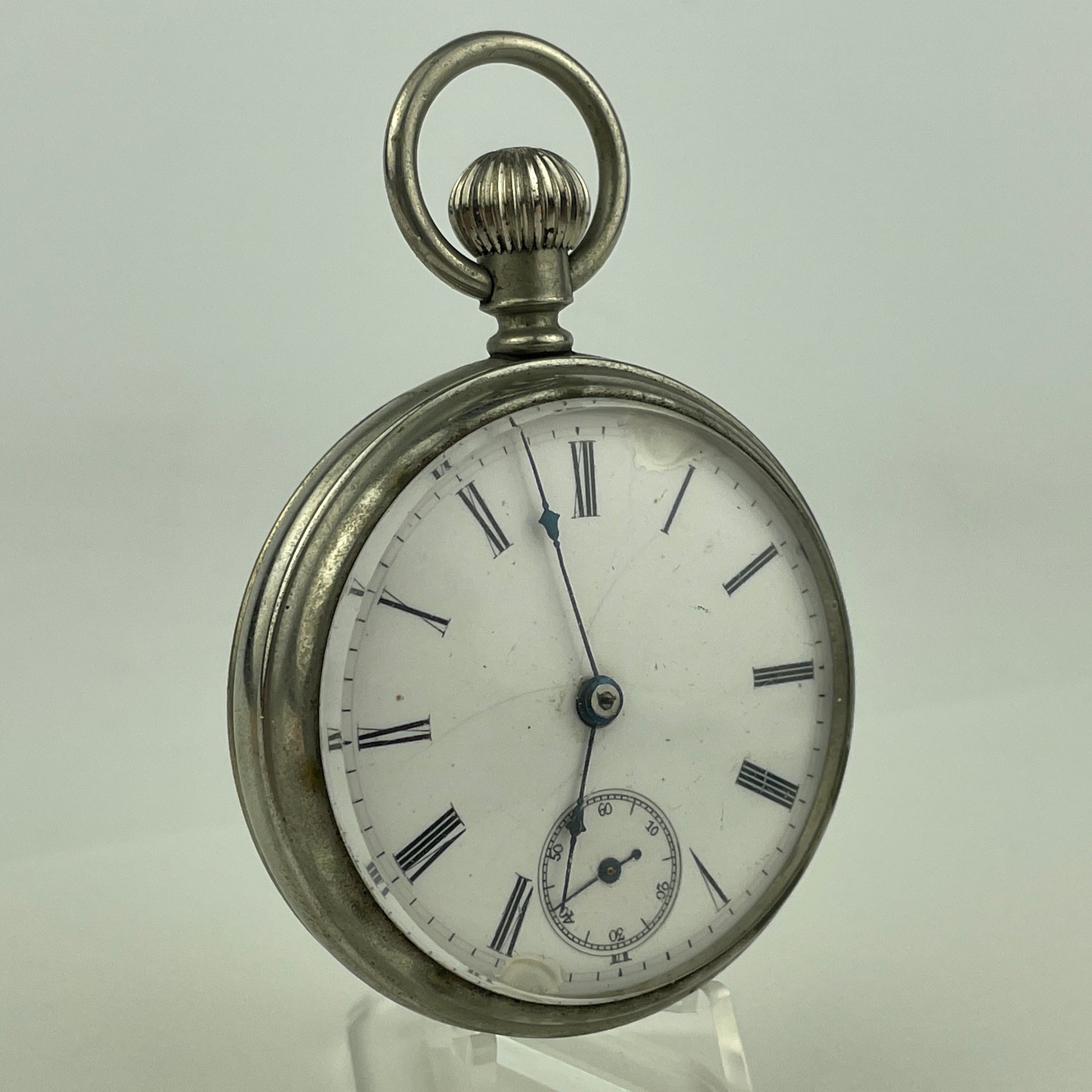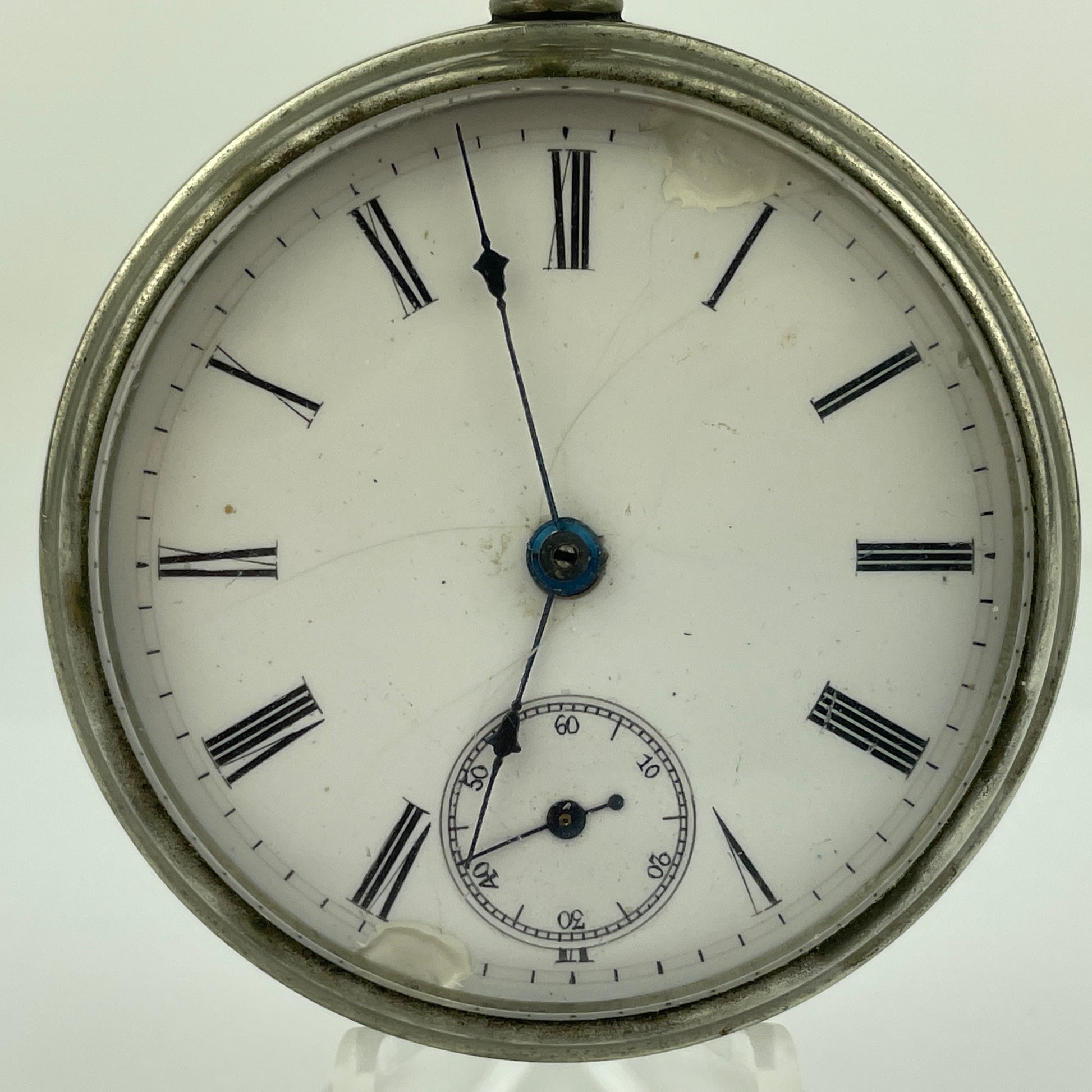Dial: Factory enamel single sunk unsigned dial. There are few hair lines, and damage near 1 and 7 o’clock.