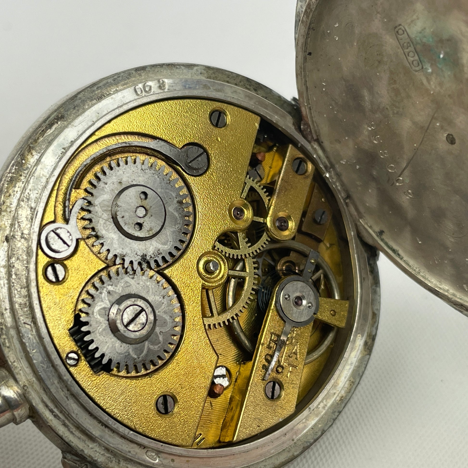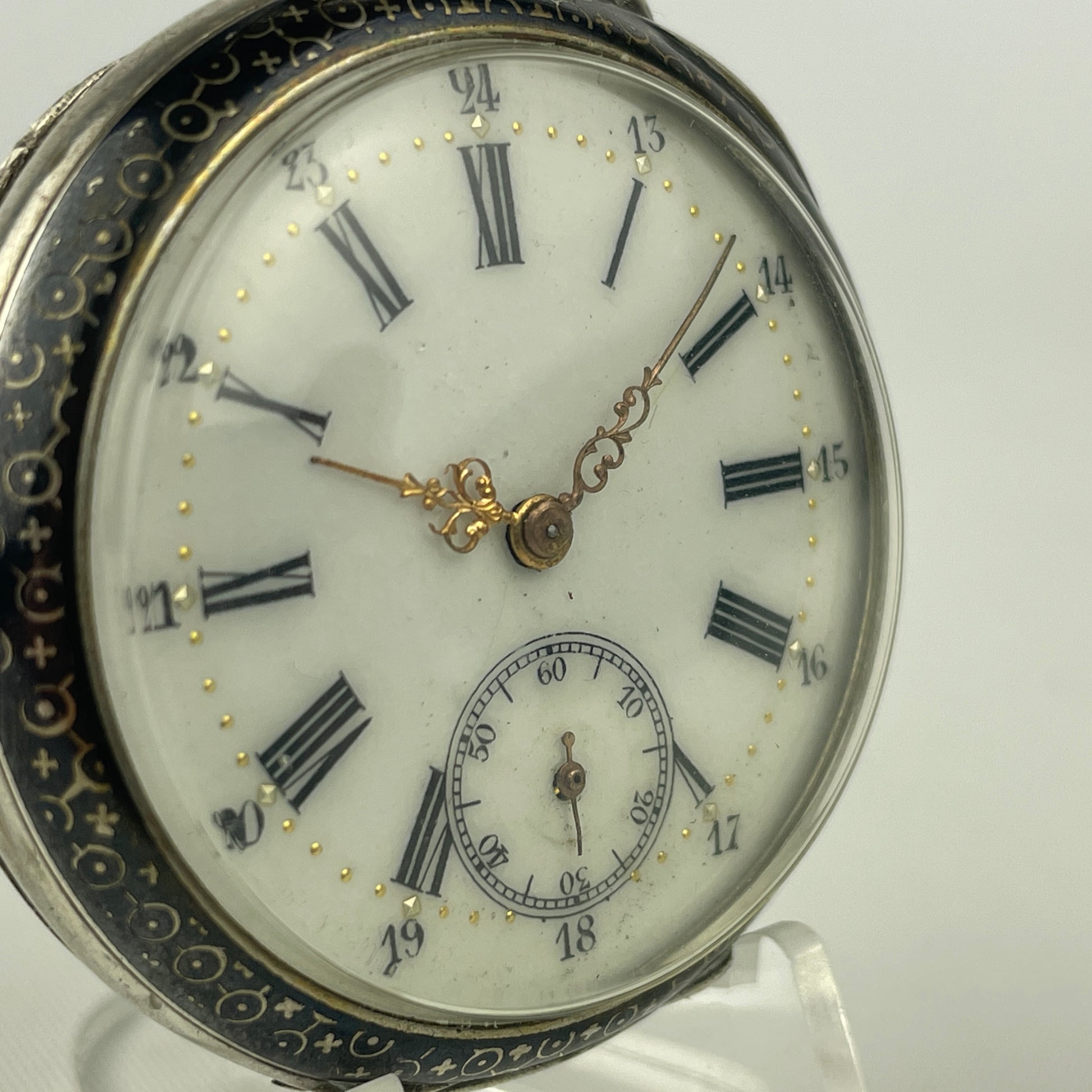 This lot contains a Swiss open face coin silver 44 MM open face pocket watch. This watch has a good crystal, silver case with fancy enamel inlay, good bow, detent stem, crown, fancy yellow hands and enamel single sunk dial with one hairline. The watch has a good clean 10 jewel movement with cylinder escapement. The watch has a broken balance staff. The case is signed coin silver 0.800. This watch will be sold as not running and for the value of the silver and movement or to be repaired. The watch has a very desirable case for the collector, dealer and repair person.