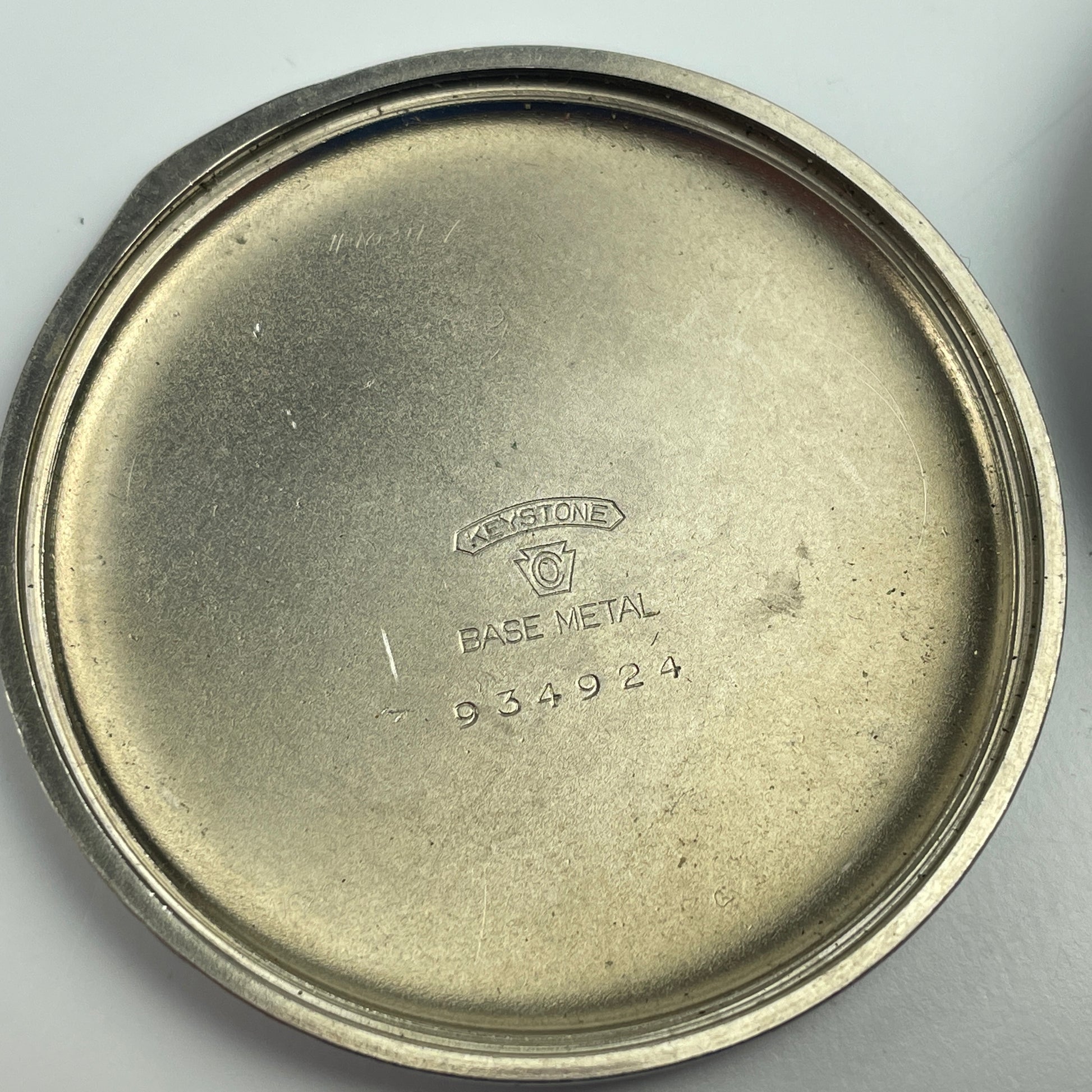This is a Longines 17 ligne open face pocket watch. This watch has a good crystal, good, blued hands, and a clean enamel dial signed “LONGINES SWISS”. The watch has a base metal open face case and a Longines 17 jewel nickel top quality ticking movement. This is a very good quality Longines movement for the serious collector. This is a hunting movement recased into an open face case. The watch does wind, set and tick with brisk motion. However, the movement was not tested for timing accuracy and, therefore, the running of the movement will not be guaranteed.