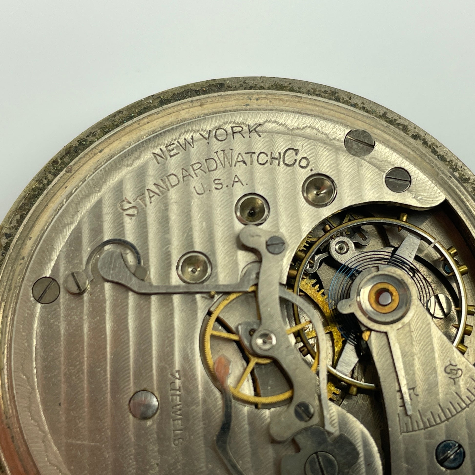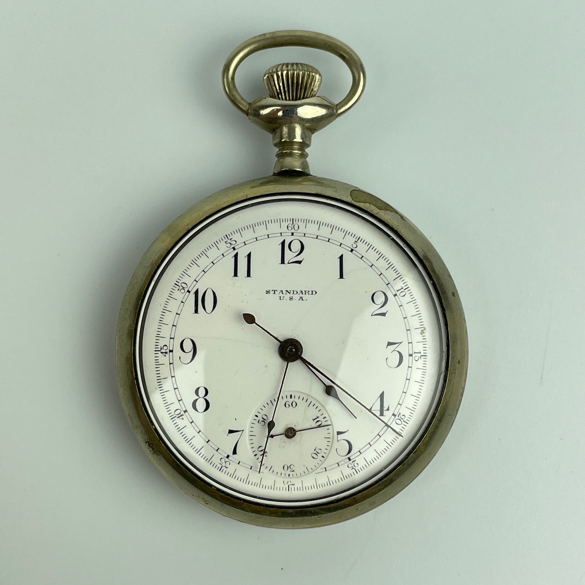 This is a New York Standard 16 size chronograph pocket watch. This pocket watch has a good crystal, good sweep second hand, good hour hand, minute hand and sub second hand. The watch has a genuine factory single sunk enamel dial signed "STANDARD U.S.A.". The dial has slight hairlines but is still very functional. The watch has a screw cover nickel case and a 7 jewel chronograph complete, running movement. The chronograph mechanism does start, stop and return to zero. The watch case has a good bow, stem, sleeve and crown. This is a clean genuine factory chronograph pocket watch. The watch was NOT tested for timing accuracy but the chronograph mechanical features were tested and they worked well.