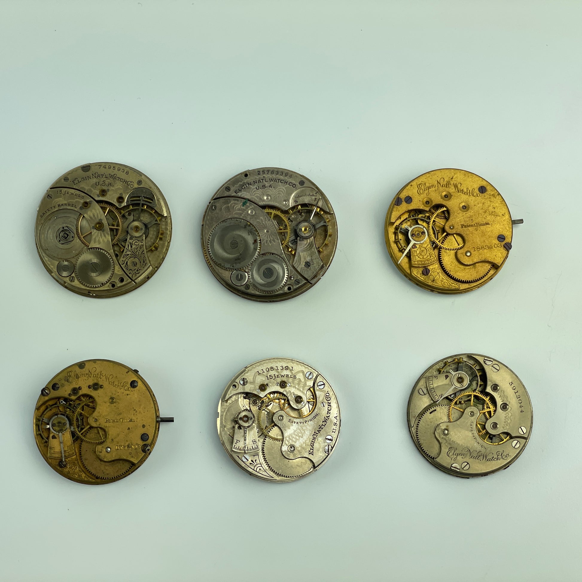 These are Elgin 6 and 12 size gilt and nickel pocket watch movements. All movements were found in a watchmaker’s Elgin movement cabinet. These are desirable movements that can be repaired or used for the vast wealth of parts they contain. There are four 6 size and two12 size movements. This is a good way to start an Elgin movement inventory.