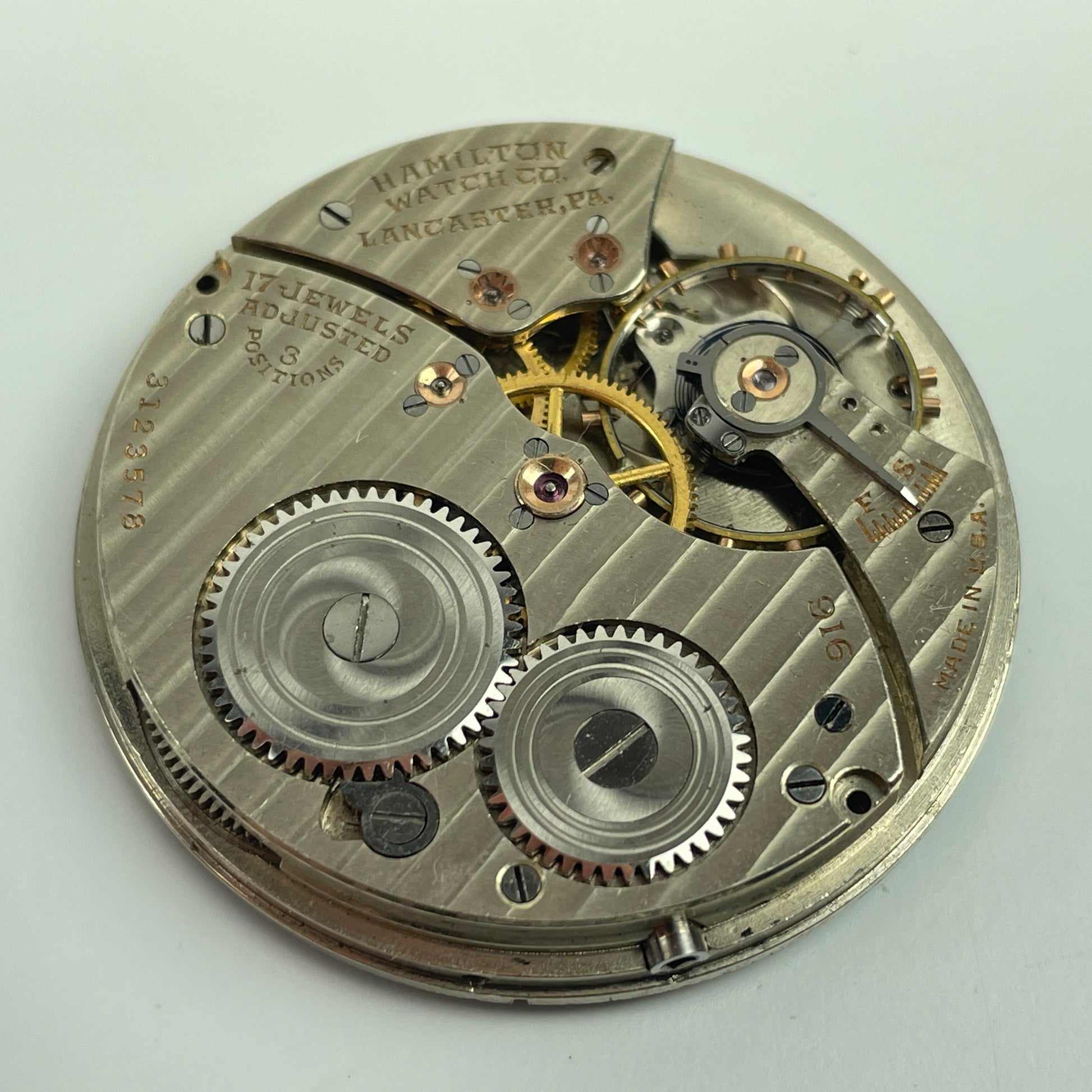 This is a Hamilton 12 size, 17 jewel, model 916 open face pocket watch movement. This movement has solid fancy blued hands and a stained single sunk functional genuine factory metal fancy dial with very bold black Arabic hour numerals. This is a good 17 jewel nickel model 916 open face movement. It is a clean, ticking open face pocket watch movement. This movement winds, sets and does tick with brisk motion. However, the movement has NO whiplash regulator. The balance staff, balance wheel and hair spring are in good condition. This is a nice spare movement that is ready for your case. The movement was NOT tested for timing accuracy. Therefore, it will be sold as not running and strictly for the vast wealth of parts it contains or for repair. This is a great movement for the Hamilton collector, dealer or repair person.