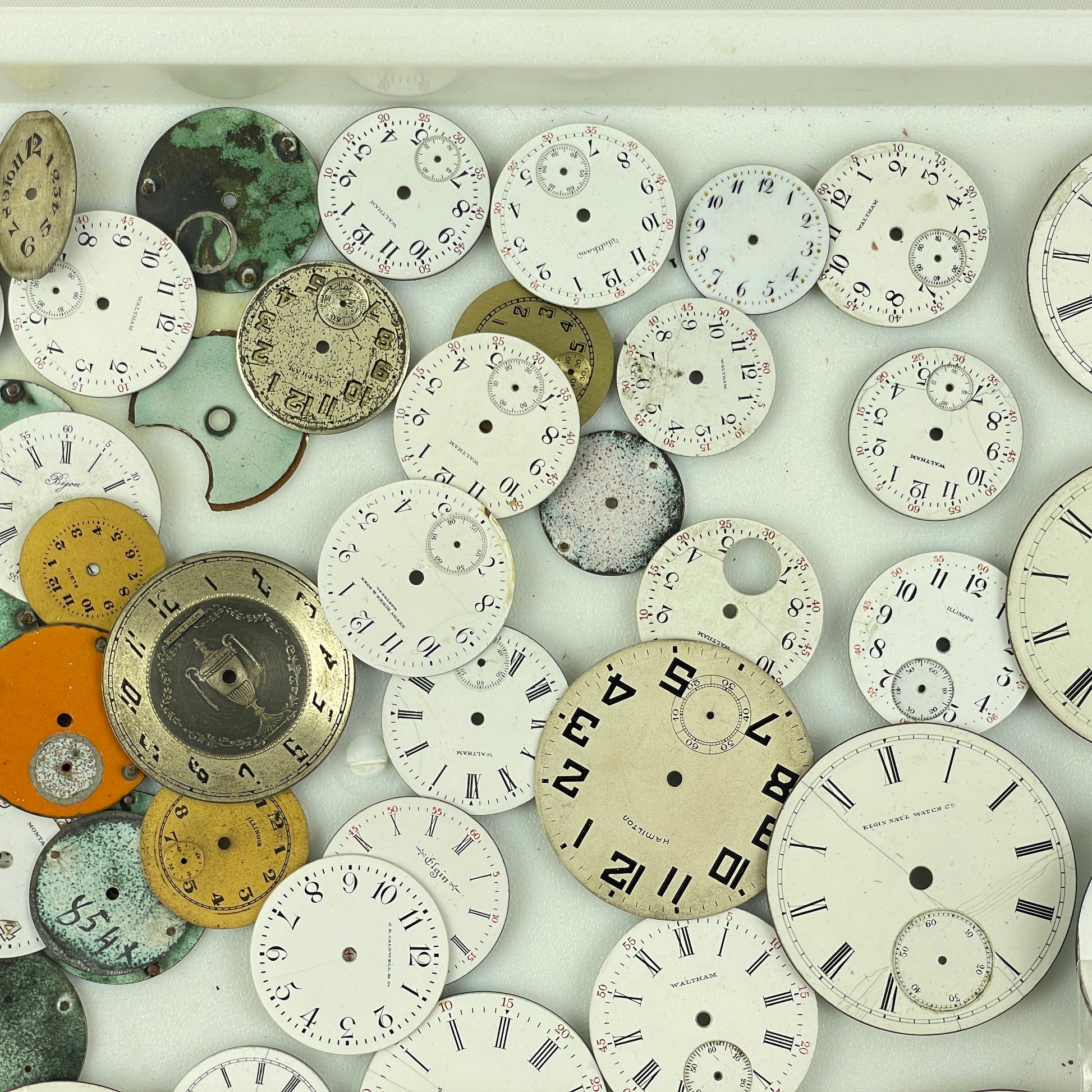 This is a good assortment of 50+ vintage enamel and metal pocket watch dials. We see dials from makers Waltham, Elgin, and Hamilton. They size from 8/0 to 18 size.