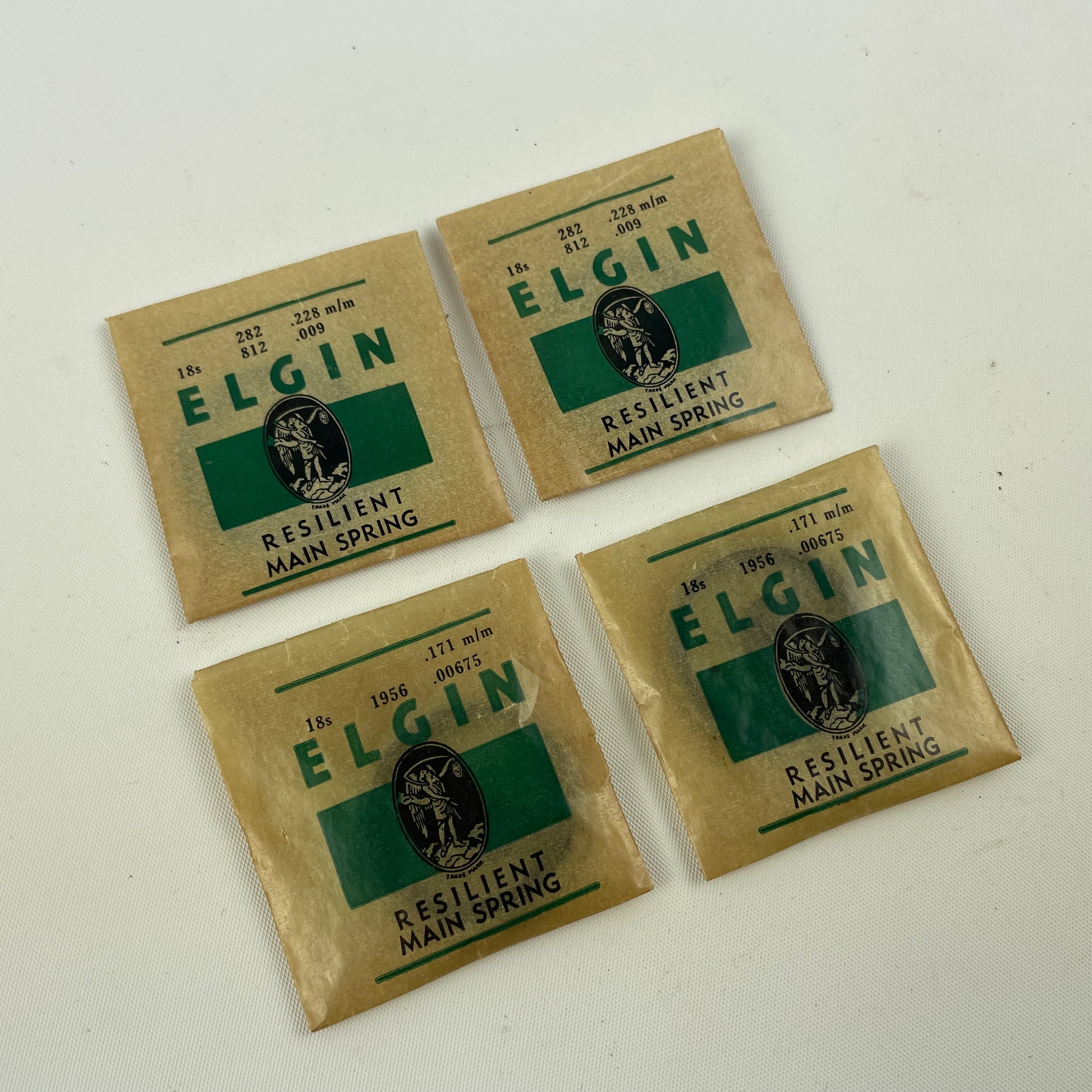 These are four (4) Elgin 18 size factory no. 812 blued new old stock factory packaged pocket watch mainsprings. These are very desirable mainsprings for the collector, dealer and repair person.