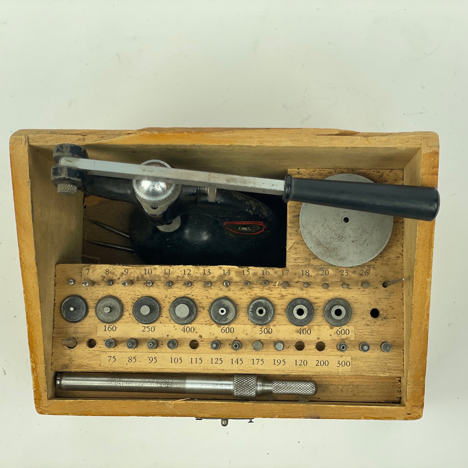 This is a Watchmaker’s Swiss Jeweling Tool. This tool has a broken box cover and four missing stumps. It will be sold as it was found it in the watchmaker’s jeweling cabinet. This is a good tool with huge potential to serious repair person and horological tool dealer.