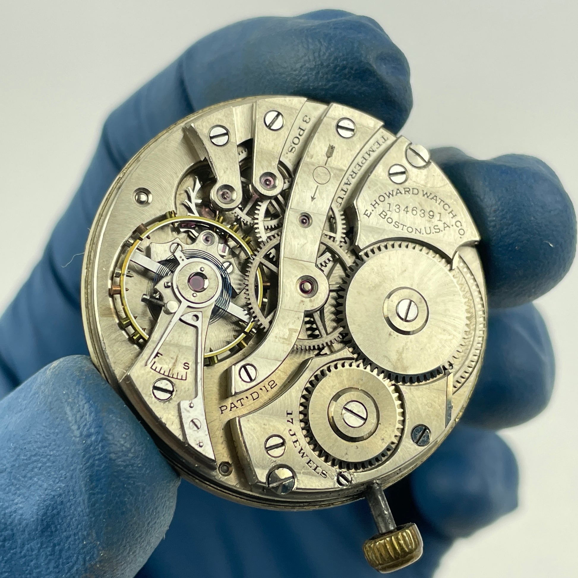 This is a nice, clean E. Howard & Co. 12 size pocket watch 17 jewel movement. This movement has genuine factory blued Howard very fancy hands and genuine factory single sunk metal dial with black Arabic hour numerals. The movement has a good stem, crown, and complete movement. The movement appears to have a good balance staff. However, it will be sold as not running and for the vast wealth of parts it contains since it has been stored away for so many years. This movement was removed from a solid gold case. this movement is simply in good clean condition. Just the use of the entire movement or the stem, crown, hands, dial, screw, wheel, jewel, pallet, or winding and setting part can save your future repair period this movement can also be repaired and put back into service.