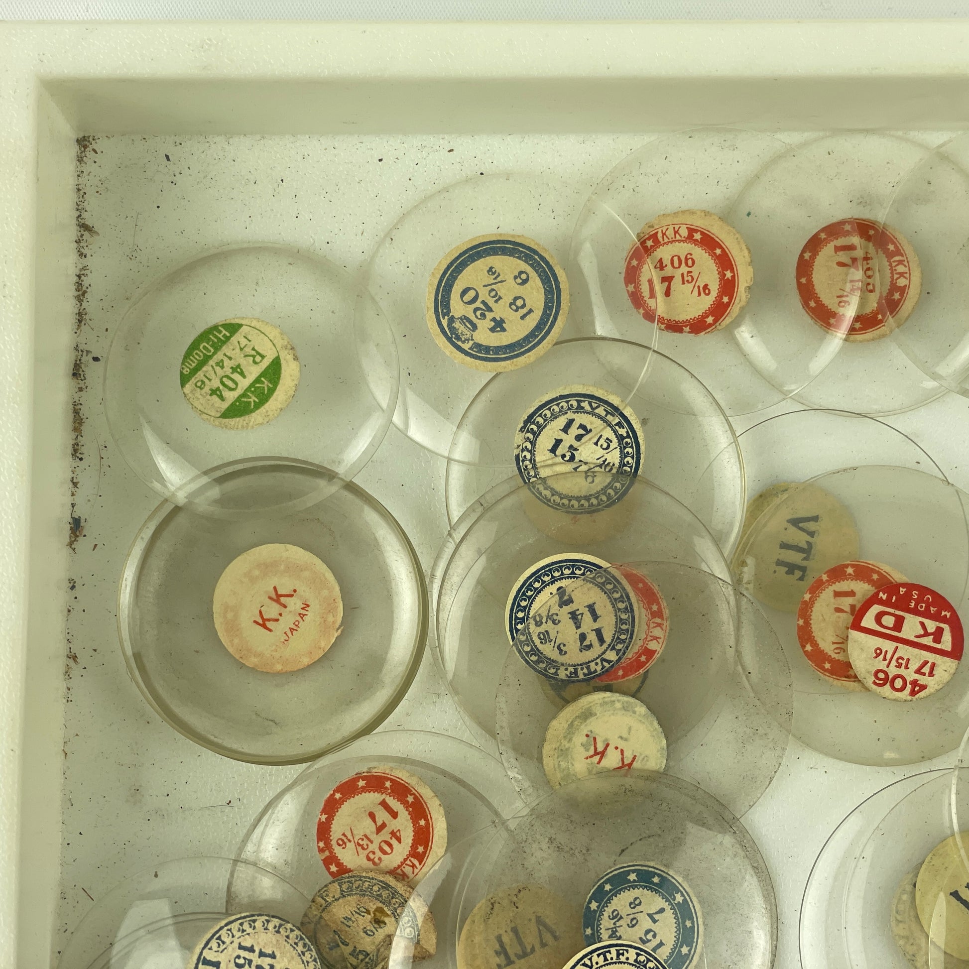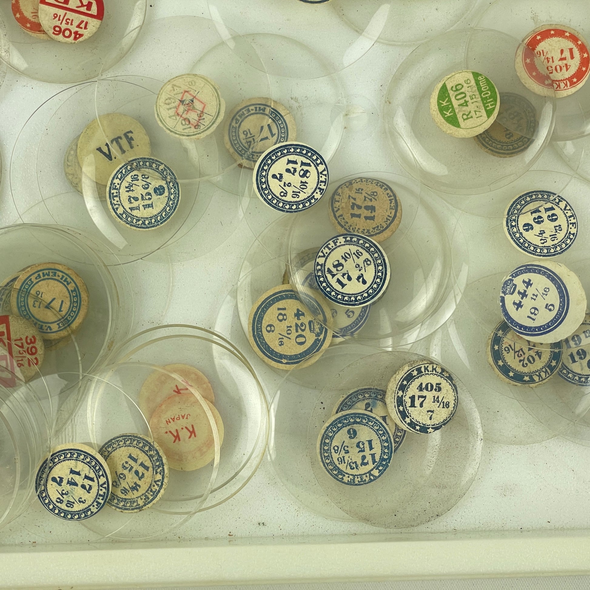 This is a selection of watchmaker’s & collector's 100 NOS glass pocket watch crystals. Please note the white tray is not included.