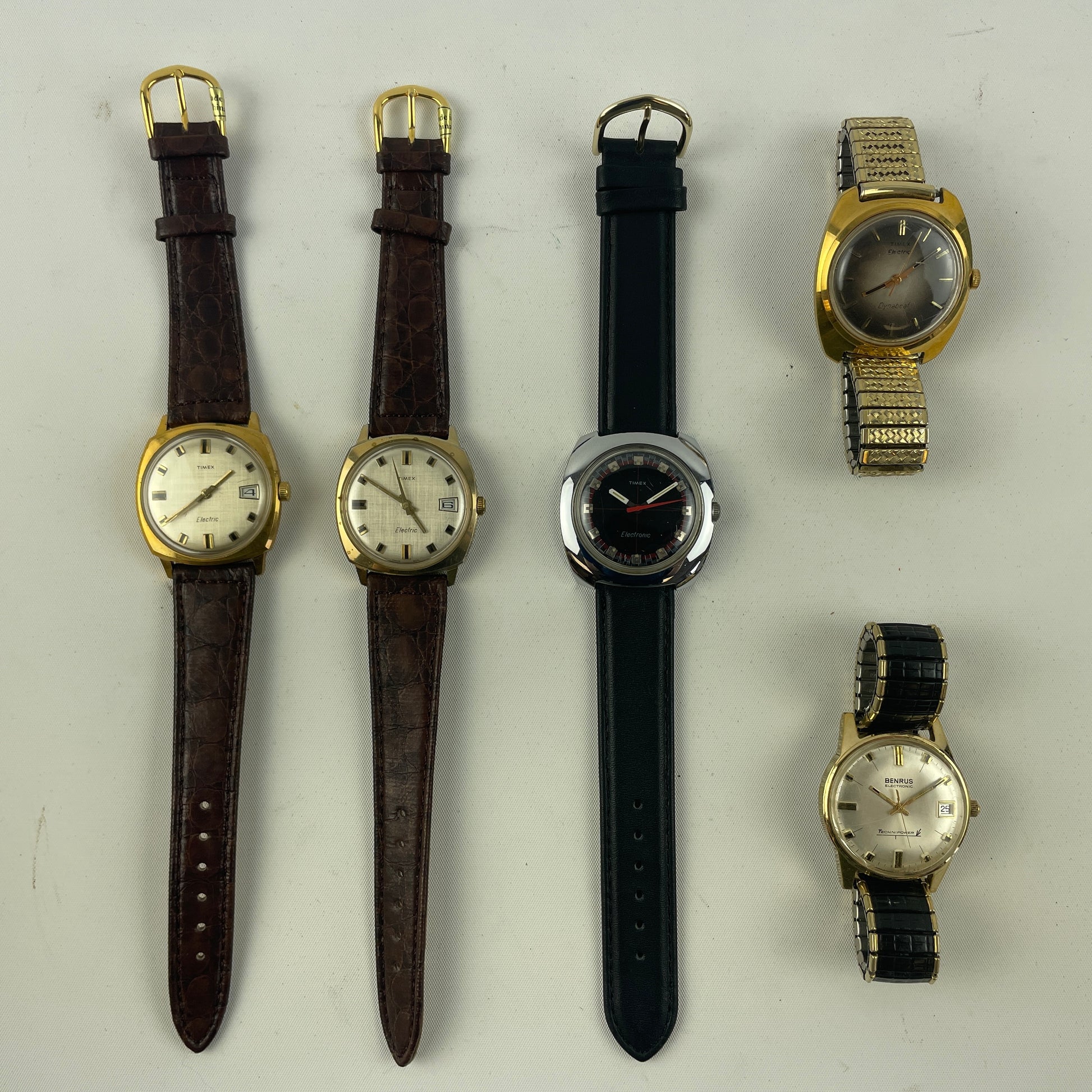 This is a selection five (5) vintage men’s electric wristwatches. Four watches are Timex, and one is Benrus. These have not been function tested and therefore will be sold in as found condition and non-running.
