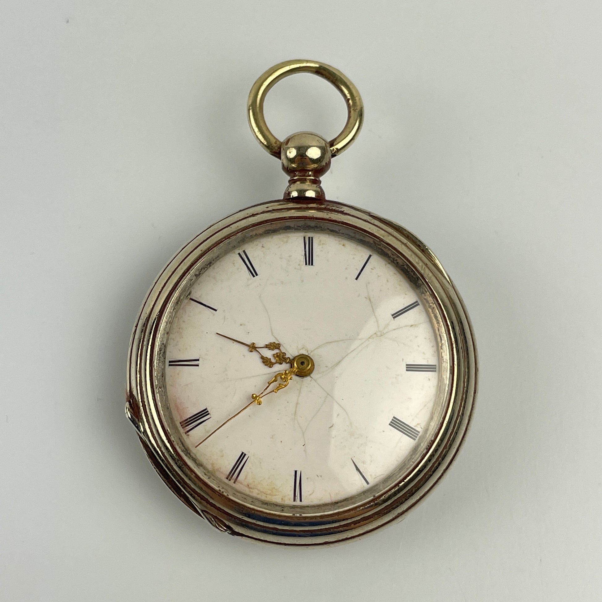 This is a Swiss key wind and key set men's 45-millimeter open face pocket watch. The watch has a good strong nickel case, good yellow fancy hands and a single sunk genuine early enamel dial with hairlines and many surface imperfections. This watch has a good bow, good front cover with good case lip, good back cover with good case slip and good dust cover. The watch is key wind and key set from the back. The watch has a typical early gilt LEPINE A movement with cylinder escapement. This watch winds, sets and runs with brisk motion. The watch was NOT tested for timing accuracy and, therefore, the running of the watch will NOT be guaranteed. It has also been stored away in a watchmaker's safe for over 40 years.